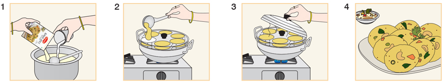 (6) Remove the mould from the cooker, let it cool for 10 minutes and then de-mould the Idlis. (7) Serve Idlis with sambhar(made with Gajanand Sambhar Masala) and coconut chutney. Note: Avoid leakage of steam from the cooker.)